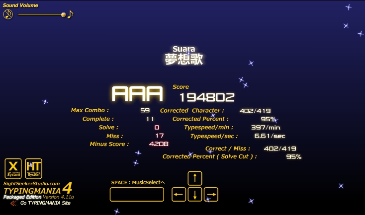 左の当サイトコンテンツよりTYPINGMANIA→DLページへと飛びそこからほしい曲をDLしてください ・準備として、拡張子が見えるように設定しておいてください